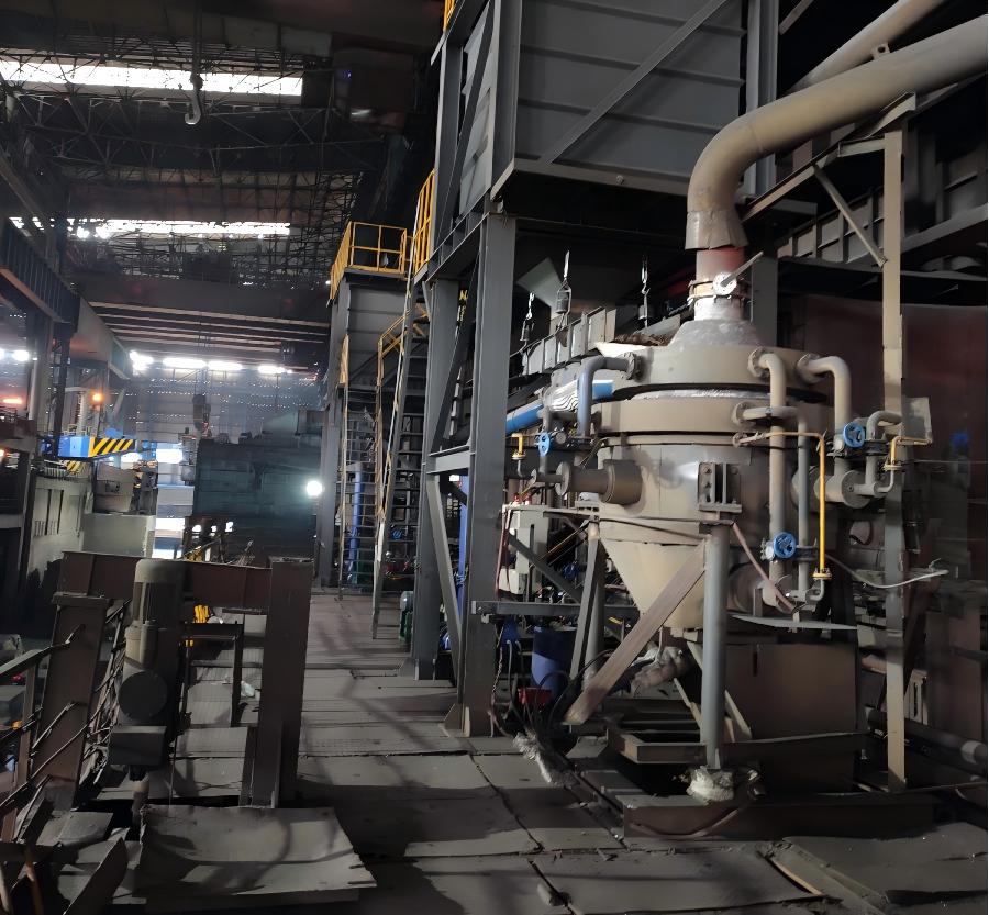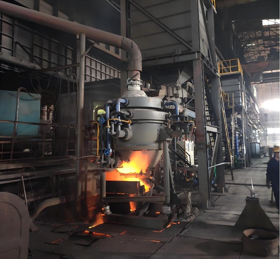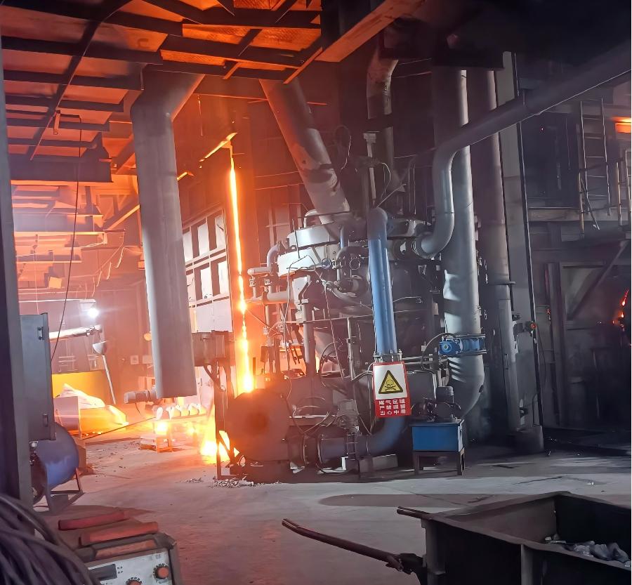 The alloy roasting device is a special alloy heating device behind the furnace, which is placed above the alloy feeding rotating pipe on the converter operation platform and a special equipment for heating a variety of alloy furnace charges such as silicon iron and manganese iron. The core furnace body of the equipment is cast from wear-resistant and hightemperature resistant alloy steel. The upper, middle and lower parts of the furnace body are equipped with multiple sets of burners, which are symmetrically distributed around the furnace body, so the high-temperature airflow heats the alloy along the tangent in the furnace body, which can effectively prevent the sintering of materials. At the same time, the thermal gas the combustion chamber can be preheated for the materials above during the process of rising, so as to achieve the purpose of energy saving.